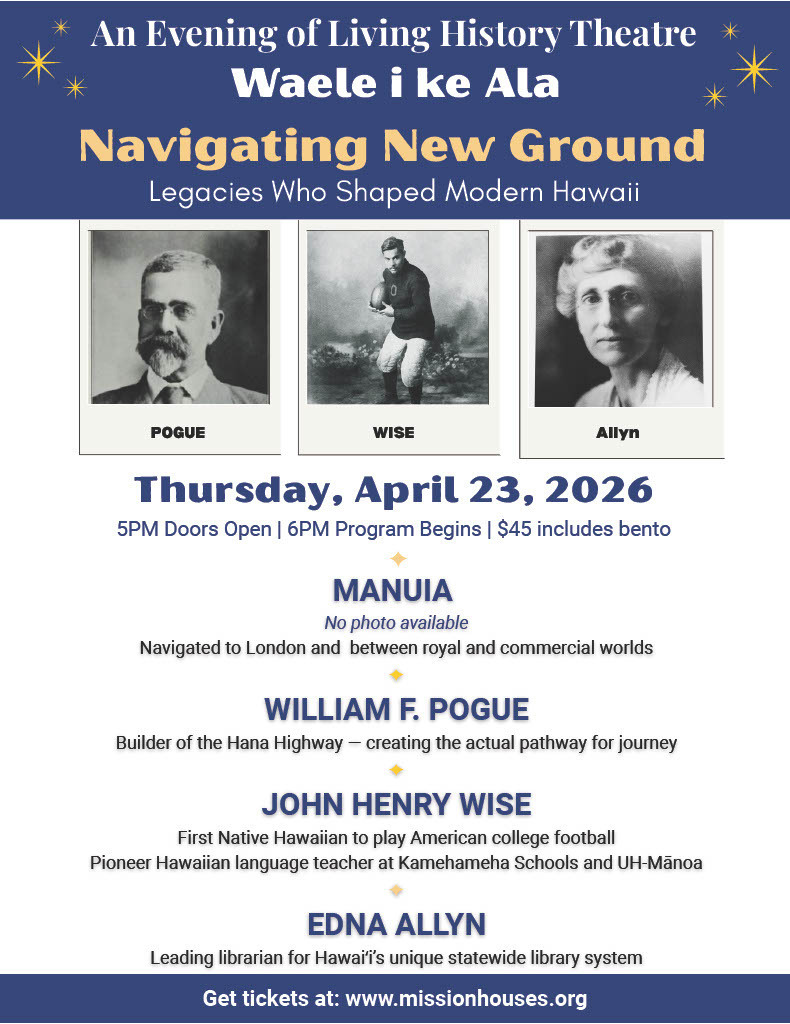 Hawaiian Mission Houses Presents An Evening of Living History Theatre:"Navigating New Ground" Four Remarkable Legacies Who Shaped Modern Hawaii Come to Life HONOLULU, HI — Hawaiian Mission Houses Historic Site and Archives invites the public to a special evening of living history theatre on Thursday, April 23, 2026, beginning at 5:00 PM. "Navigating New Ground" brings to life four historical figures who shaped modern Hawaiʻi through their remarkable journeys - across oceans, through institutions, and between cultures