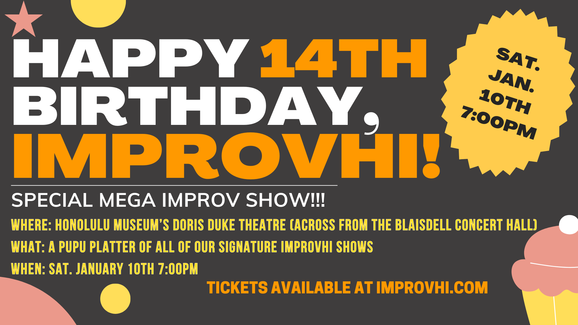 Join us for a one-night-only TWO ACT birthday blowout featuring our signature short form, long form, musical improv, and, yes... a little freestyle rap action too. The entire improvhi crew is throwing it down live at the gorgeous Doris Duke Theatre, and you’re invited to the party.