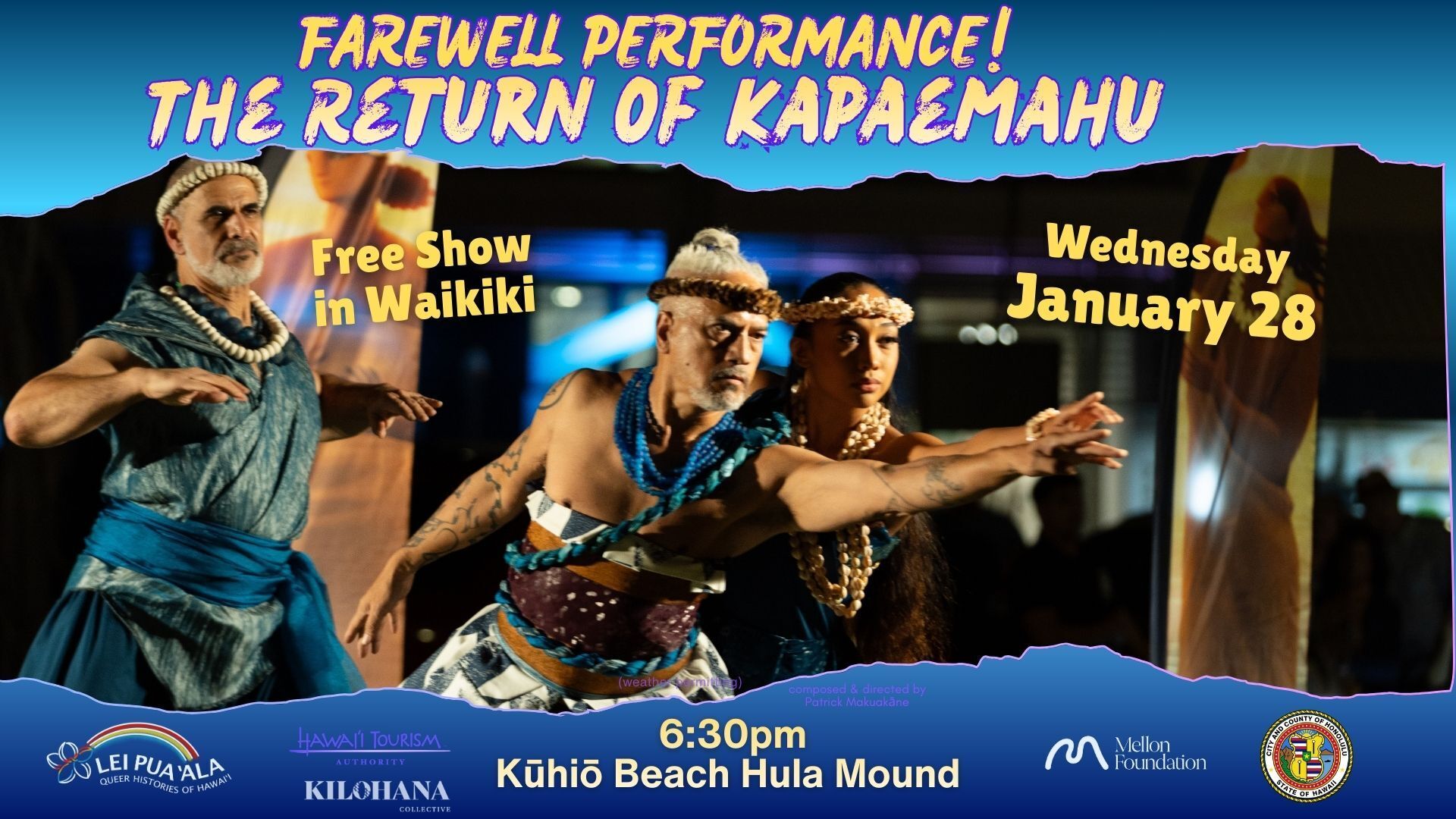 Lei Pua ‘Ala’s hula show The Return of Kapaemahu chronicles the story of four voyagers of dual male and female spirit journeying to bring healing arts from Tahiti to Hawai‘i. Based on an Oscar-nominated short film, and directed by hula master Patrick Makuakane, the show honors the legacy of gender and sexual diversity in the islands and blends traditional hula with modern music. This is the final performance of a one year run, and will be followed by a special trubute to the nearby healer stones.
