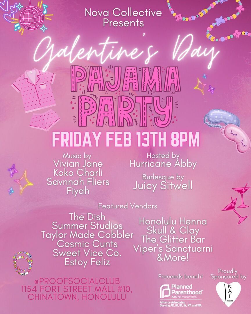 Nova Collective presents Galentine's Day Pajama Party at Proof Social Club - celebrating femme-centered community and joy. Hosted by Hurricane Abby, with local vendors, burlesque performances by Juicy Sitwell and live music by Koko Charli, Savannah Fliers, Vivian Jane and Fiyah