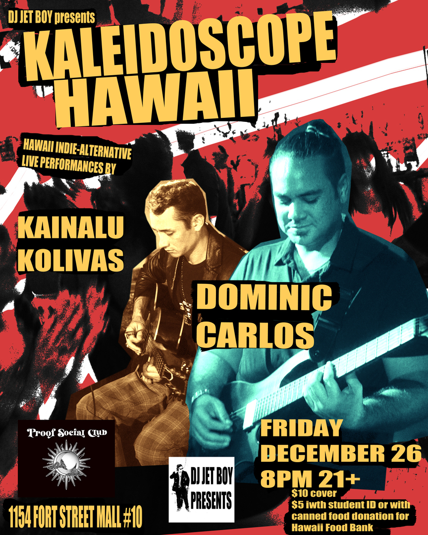 DJ Jet Boy presents Kaleidoscope Hawaii at Proof Social Club, featuring live indie rock performances by Dominic Carlos and Kainalu Kolivas