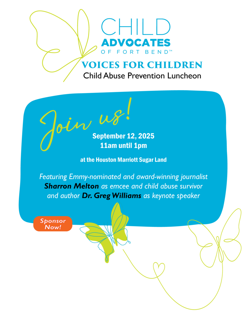 Join us for Child Advocates of Fort Bend’s inaugural Prevention Luncheon featuring Emmy-nominated and award-winning journalist Sharron Melton as emcee and child abuse survivor and author Dr. Greg Williams as keynote speaker. This event serves as a fundraising opportunity with proceeds directed toward resources, support for children and families suffering the effects of child abuse, and safety education to prevent children from being abused.
