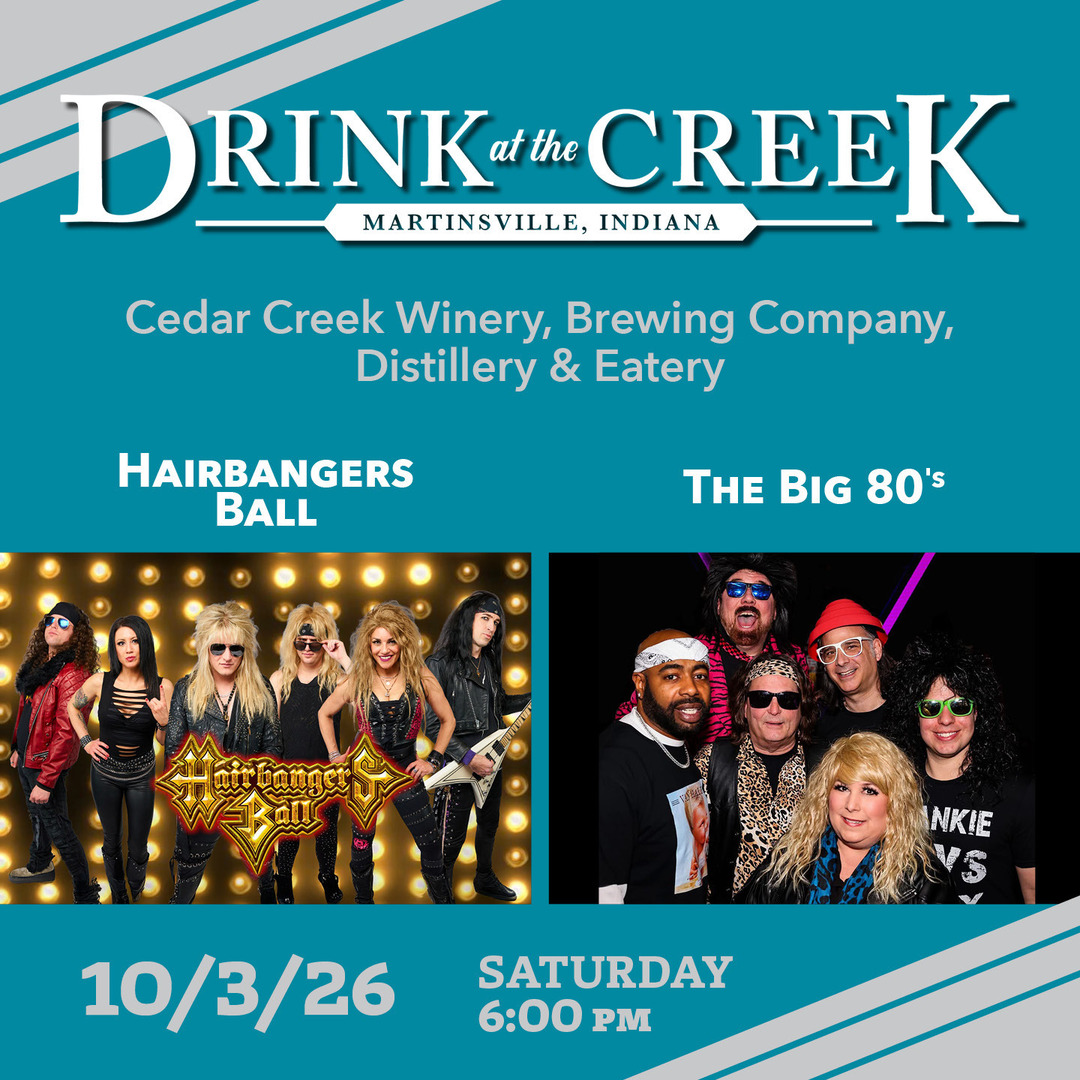 Hairbangers Ball& The Big 80'sYou will be able to purchase tickets at the gate on the day of show. Cedar Creek Winery, Brewing Company & Distillery3820 Leonard Road, Martinsville, Indiana 46151NO Pets on Concert days, except service dogsNO COOLERS! (New Venue Rule)No Chair sleeves! (New Venue Rule)No outside alcohol!No tents or large umbrellas!No Chairs with umbrellas or flip top shade canvas!NO PASS OUTS- NO Re Entry after 4pmAfter 4pm everyone must have a ticketFree Parking, Children 12 & Under FreeAll Tickets: $15.00 Advance, $20.00 Day of Show (+ Applicable fees)4 for $40 tickets (+ Applicable fees) can ONLY be purchased ONLINE BEFORE Day of ShowHairbangers BallRolling through the “Decade of Decadence” like a 50-ton freight train, iconic bands such as Guns N’ Roses, Mötley Crüe, Bon Jovi, and Poison (to mention only a few) made the 1980’s a musical era the likes of which we’re doubtful to see again. Millions upon millions of records were sold, and concert venues around the world sold out within seconds when these bands were announced as headliners... In 2001, lamenting the heyday of hairbands, one Chicago band sought to rekindle the flame for these Gods of Rock by tapping into the nostalgic and undeniable energy of that bygone era. They called themselves Hairbanger’s Ball. Born from a “what if?” scenario, Hairbanger’s Ball has entrenched themselves as one of the most sought after “80’s Hair Rock Tribute Bands” in the United States after years of performing sold out shows from coast to coast, all while exuding the same expert musicianship and flair for the theatrical as their idols. Now on the cusp of celebrating 25 years in existence, Hairbanger’s Ball has been a mainstay in music for longer than some of their celebrity counterparts, and routinely perform over 150 shows a year. The Big 80'sThe Big 80's Tribute Band has 20 years under its fanny pack taking party-goers on a venture back in time! Big hair, big lights, big sound, light-up dance floors surrounded by the sometimes cheesy, always awesome music of the crazy 80’s! And when we say "tribute", we mean it. This isn't a random group of musicians that just PLAY Michael Jackson and Madonna and try to pass off as an 80's band. No my friend... This is a tight-knit "Member's Only" crew of friends who, for better or for worse, are dedicated to keeping 1985 alive! We'll bring the totally rad costumes, chair-sized Rubik's cubes, epic stage props and MTV choreography. All you need to do? Grab your parachute pants, Aquanet, raspberry berets, and your bandanas and we'll meet you on Electric Avenue.Join our RD Productions VIP Text ListText RDP to815-240-3435Sign-up to receive concert updates!RD Productions, LLC Ticket Refund PolicyAll ticket sales are final and non-refundable.In the event the concert is cancelled due to extreme weather or other circumstances,RD Productions, LLC will give a full ticket refund within 90 days of the concert date.If the concert is scheduled for another date tickets can be used for that concert only.However once any of the performance starts at any RD Productions, LLC concert, there will be NO Refunds!