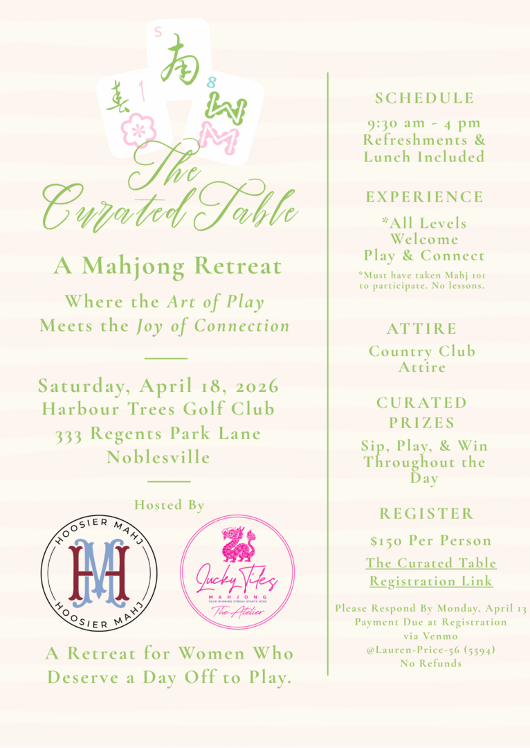 Join us at Harbour Trees Golf Club on Saturday, April 18, for a beautifully curated mahjong retreat hosted by Lucky Tiles Mahjong + Hoosier Mahjong—where the tiles are set, the tables are styled, and the only thing on your agenda is to relax and play.