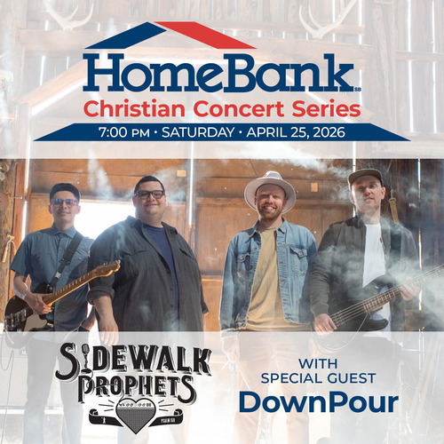 HomeBank Christian Concert SeriesStarring Sidewalk Prophetswith Special Guest DownPour Saturday April 25, 2026 7:00pmTickets General Admission Tickets:$30.00 AdvanceVIP Tickets: $75.00 per person,includes Q&A Session with Sidewalk Prophets, plus pick your seat.(Only 100 Available)5:00pm- VIP Doors5:20pm- Q & A with Sidewalk Prophets (VIP Only)6:00pm- General Admission Doors7:00pm- Downpour8:30pm- Sidewalk ProphetsAll Ages, Everyone must have a ticket.Please note: Ticket sales will be suspended at 2PM on the Day of Show but you will still be able to purchase tickets at the door!!