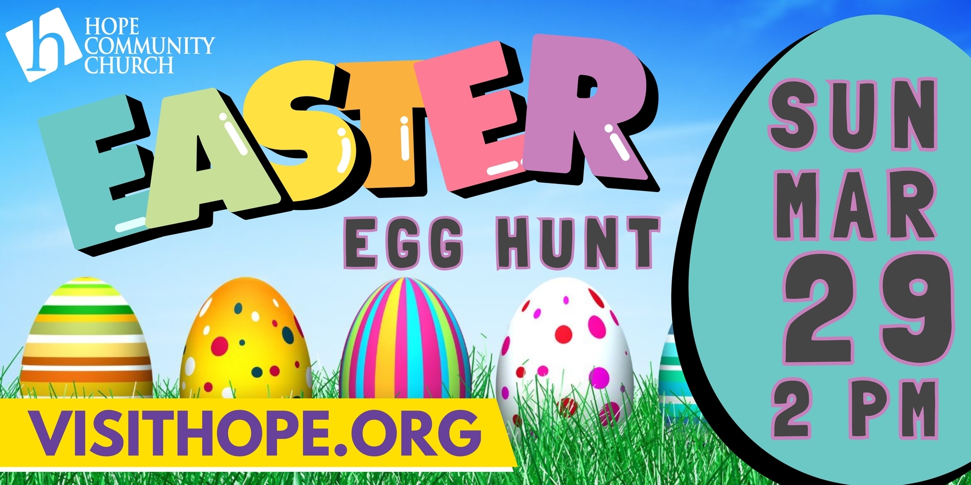 Areas will be separated for specific ages (0-3, 4-6, 7-9, 10-12) so that everyone will leave with lots of fun, prizes, and treats. Please arrive early to park and enter our free drawing for basket giveaways. All activities will take place outdoors, so please dress appropriately. The egg hunt will start promptly at 2 p.m. This is a FREE event. Please pre-register at: https://visithope.org/