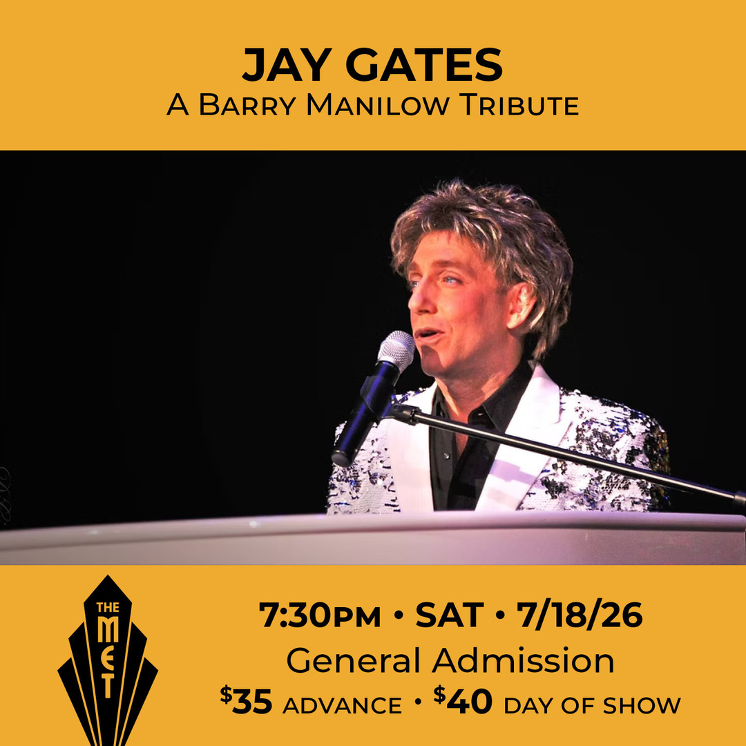 Jay Gates,A Barry Manilow TributeJuly 18, 2026 7:30Doors open at 6:30 PMAdvance Ticket $35 + Applicable feesDay of Show Ticket $40 + Applicable feesFood and beverages are on the premises.There will be no outside food or drinks permitted.Join us for a great night of Music and Fun!Jay Gates Barry Manilow TributeNo stranger to the tribute world, Jay Gates’ impersonation of Barry Manilow has “Fanilows” agreeing that this act is rapidly becoming THE show to see! Be it the classic Copacabana, sing-along Can’t Smile Without you, or show-stopping Even Now, Jay’s faithful representation of Barry’s voice combined with a jaw dropping visual portrayal and multimedia presentation always leaves audiences wanting more!