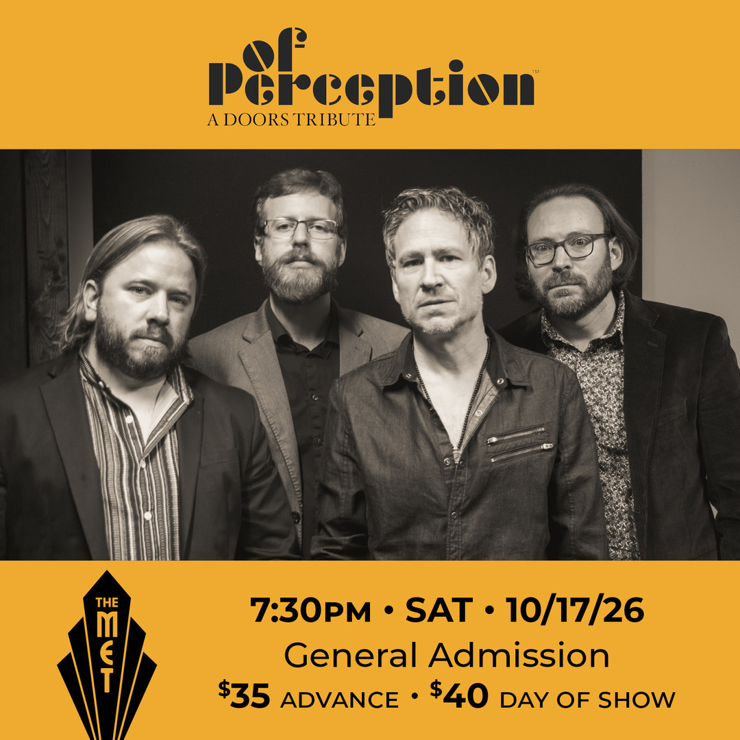 Of Perception,A Doors TributeOctober 17, 2026 7:30Doors open at 6:30 PMAdvance Ticket $35 + Applicable feesDay of Show Ticket $40 + Applicable feesFood and beverages are on the premises.There will be no outside food or drinks permitted.Join us for a great night of Music and Fun!Of Perception Doors TributeCome out to one of Of Perception’s shows and get a chance to experience the music of The Doors! Of Perception is an authentic Doors tribute band performing in the Chicagoland area that replicates the sound and look of The Doors. Perfect for any festival, club, theater, or party, and appropriate for all ages, Of Perception is the best tribute band in the area!