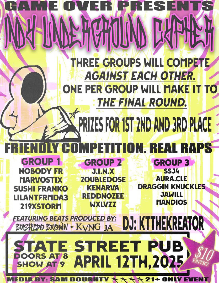 Game Over Collective presents the INDY UNDERGROUND CYPHER.. A local rap battle where three groups will compete against each other. One per group will make it to the final round. Prizes for 1st, 2nd and 3rd place.. FRIENDLY COMPETITION. REAL RAPS.