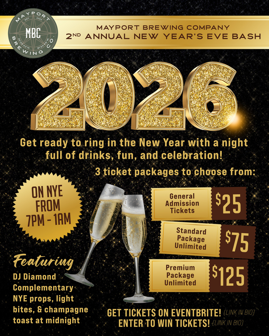 Celebrate the arrival of 2026 at Mayport Brewing Company’s 2nd Annual New Year’s Eve Bash. Enjoy a night filled with music, drinks, and celebration as we count down to midnight in true Mayport style.