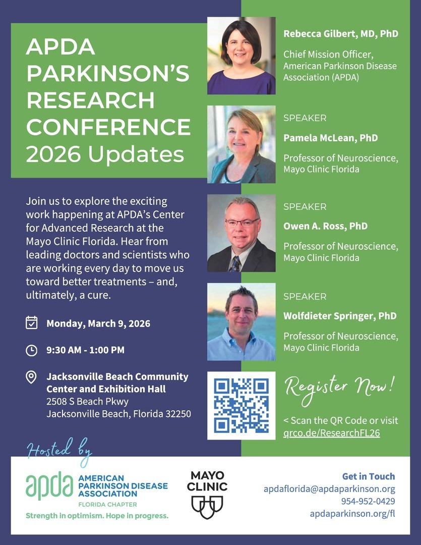 The American Parkinson Disease Association (APDA) and the Mayo Clinic in Jacksonville invite you to a special research conference highlighting the exciting work happening at the APDA Center for Advanced Research. This event brings together leading doctors and scientists who are working every day to better understand Parkinson’s disease and develop new treatments.