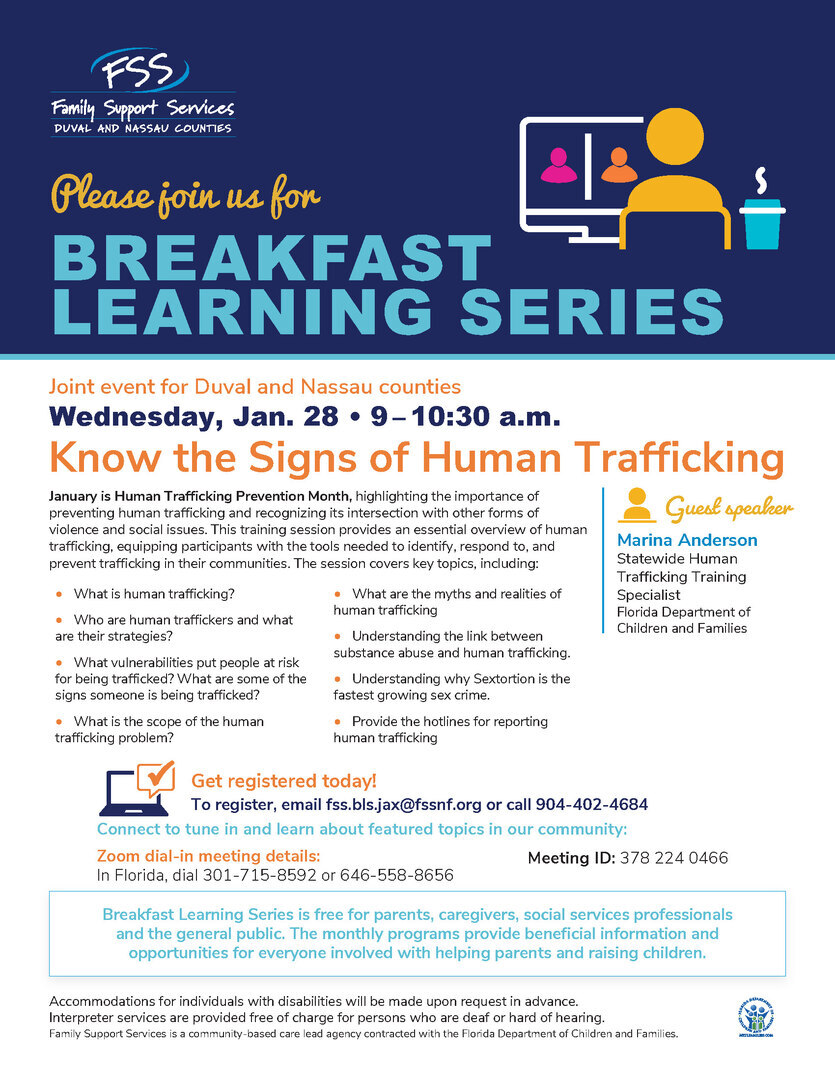 January is Human Trafficking Awareness and Prevention Month. Join us Wednesday, Jan. 28, 2026 at 9 a.m. for a free, virtual learning session with Marina Anderson, Trafficking Training Specialist with the Florida Department of Children and Families.