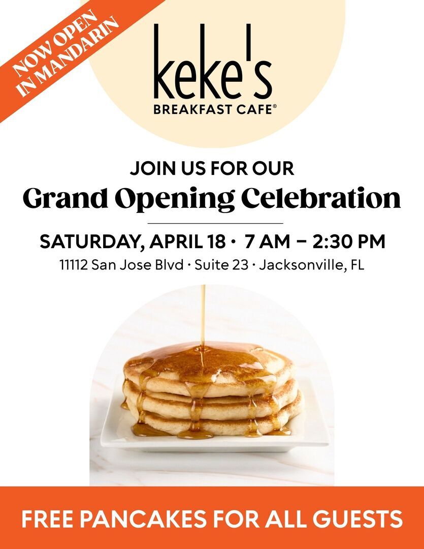 Keke’s Breakfast Cafe is NOW OPEN in Mandarin from 7:00 AM to 2:30 PM, serving made-to-order breakfast, brunch, and lunch in a relaxed, family-friendly setting. Keke's invites the community to join them for a GRAND OPENING celebration on Saturday, April 18th featuring FREE PANCAKES for all guests with purchase, complimentary coffee coupons, and a raffle every hour to win breakfast for two for a month!