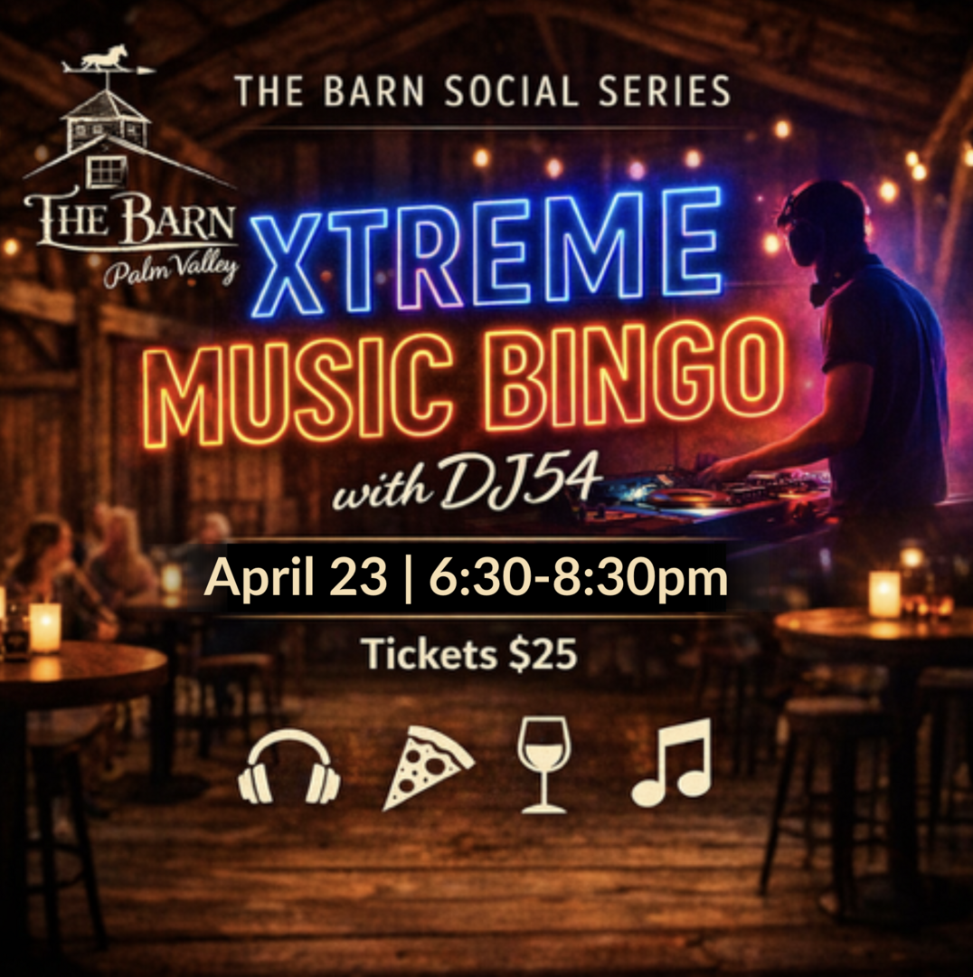 Xtreme Music BingoPart of The Barn Social SeriesJoin us for a high-energy twist on traditional bingo inside the warm, rustic setting of The Barn.Instead of numbers, you’ll mark songs as DJ54 spins crowd favorites across decades and genres. It’s interactive, competitive, and full of sing-along moments.This is a social night out designed for adults and friend groups — but open to all ages.✨ Bring Your Own Beverage🍕 Food Services by V Pizza🎶 Prizes + great musicWhether you're planning a casual date night, meeting friends, or just looking for something different to do on a Thursday — this is your midweek reset.Part of The Barn Social Series, a rotating lineup of interactive entertainment nights.📅 April 23⏰ 6:30 PM – 8:30 PM📍 The Barn – Palm Valley🎧 Featuring DJ54🎟 Tickets $25 + Processing Fee: $3.29