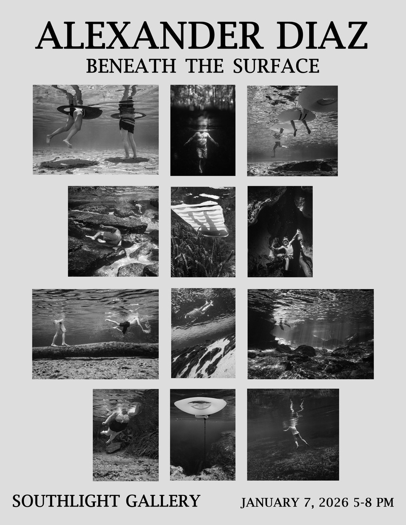 Diaz’s stunning images dive into Florida’s natural springs, capturing the contrast between bustling summer crowds above and the serene, otherworldly beauty below. Experience a powerful visual journey that reveals Florida’s hidden tranquility and celebrates the fragile ecosystems that make our state unique. A must see exhibition to start your year with inspiration!