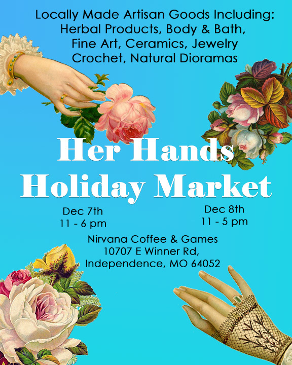 Her Hands Holiday Market started several years ago and used to be hosted at Aquarius downtown. Nirvana Coffee and Games promises to be a great new venue for our market! It has an accessible entrance and three prominent parking lots, available at the front of the store, behind the store, and nearby across the street.