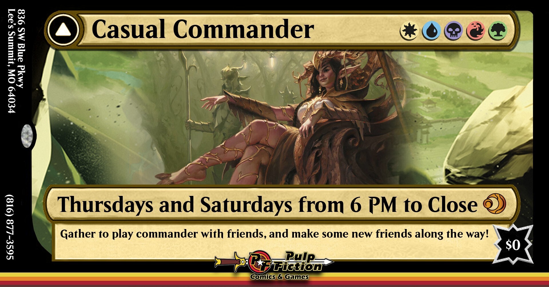 HomeEventsCasual Commander Casual Commander Thursday, February 19, 2026 6:00 PM - 9:00 PM 6:00 PM - 9:00 PM See all dates and Times Pulp Fiction Comics & Games Parking Deals Get a Ride LYFT UBER Add to Calendar 02/19/2026 06:00 PM 02/19/2026 09:00 PM America/Bahia_Banderas Casual Commander Open House Style // Come and go as you please any time between 6 PM and 11 PM Details & Tickets: https://www.upcomingevents.com/kansas-city/events/pulp-fiction-comics-games/casual-commander-604616?ref=uceaddevent Pulp Fiction Comics & Games, 836 Southwest Blue Parkway, Lee's Summit, MO, 64063 Set Reminder Categories Games & Prizes, Kid-Friendly, Kids & Family, Organizations & Meetups Neighborhoods Highview Estates (Kansas City)Little Blue Valley (Kansas City)Robandee South (Kansas City)Unity Ridge (Kansas City) Open House Style // Come and go as you please any time between 6 PM and 11 PM
