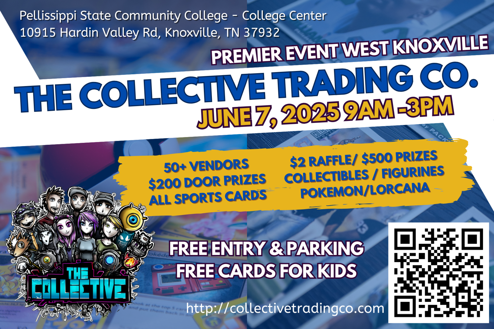 Get ready for Knoxville's premier monthly card show experience! The Collective's Monthly Showcase is your one-stop destination for everything sports cards, Pokémon, Magic: The Gathering, Yu-Gi-Oh!, and amazing collectibles! Join us every month at the conveniently located Pellissippi State Community College - College Center for a day of discovery, deals, and community!