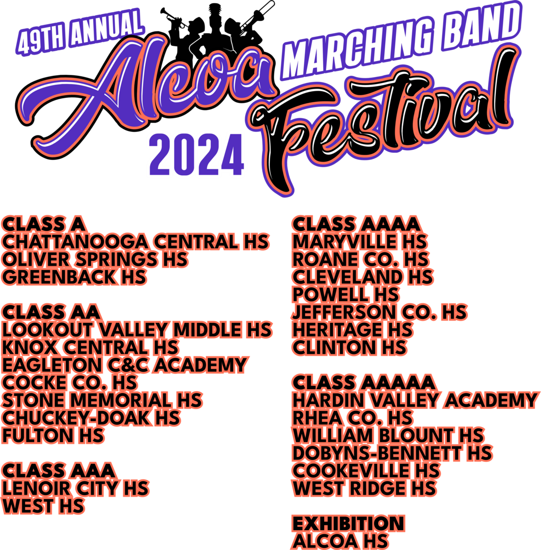 The 49th Annual Alcoa Band Festival will take place on Saturday, October 26, 2024, at the Alcoa High School Football Field. 25 bands are participating. The first band takes the field at 10:45 a.m. The public is invited to come and enjoy a wonderful day of music and amazing performances. The cost of admission is $11.00. Tickets can be purchased online at https://gofan.co/event/1987348?schoolId=TN11296 or at the gate.