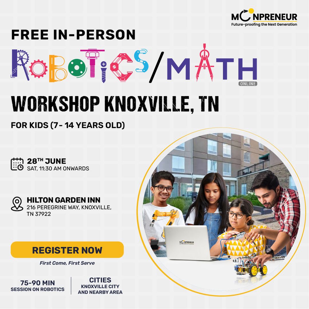 Moonpreneur welcomes you and your child to our upcoming free in-person robotics and math workshop in Knoxville, TN, on 28th June, Saturday, 11:30 AM EST.
