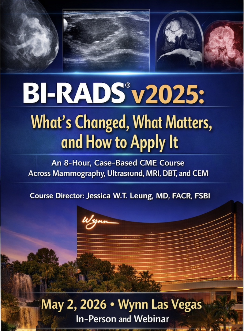 This full-day, 8-hour CME course provides a practical, case-based deep dive into the most important changes across mammography, digital breast tomosynthesis, ultrasound, MRI, and contrast-enhanced mammography. Faculty will highlight what has changed, why it matters, and how to implement BI-RADS v2025 confidently and consistently in daily practice.