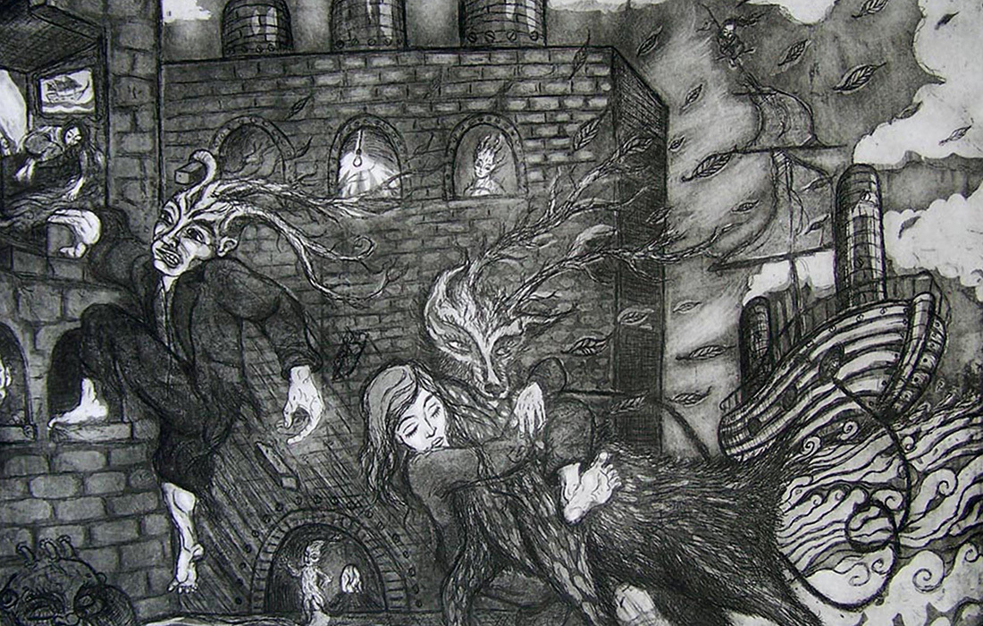 Learn and practice techniques for drawing on a copper plate, etching the plate, and printing with a press.