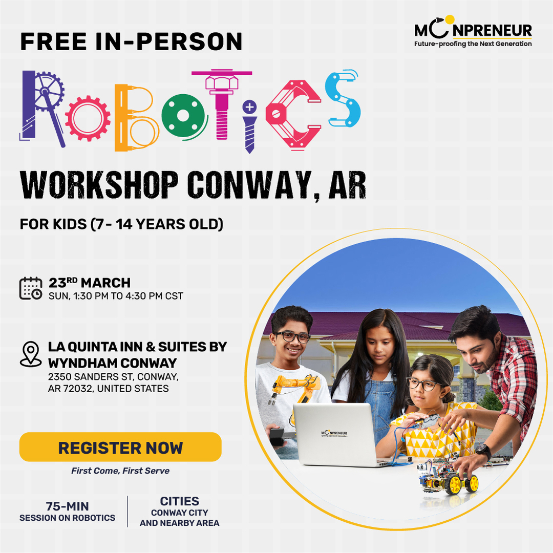 Moonpreneur welcomes you and your child for our upcoming free in-person robotics workshop in Conway, AR on Sunday, 23rd March at 01:30 PM CST.