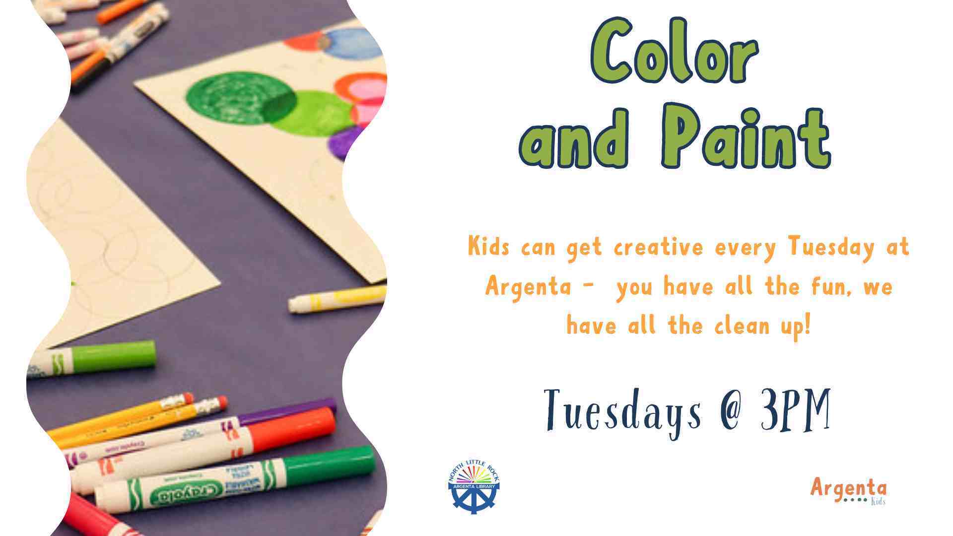 Every Tuesday afternoon, join Argenta Kids as we color and paint our way through the day!