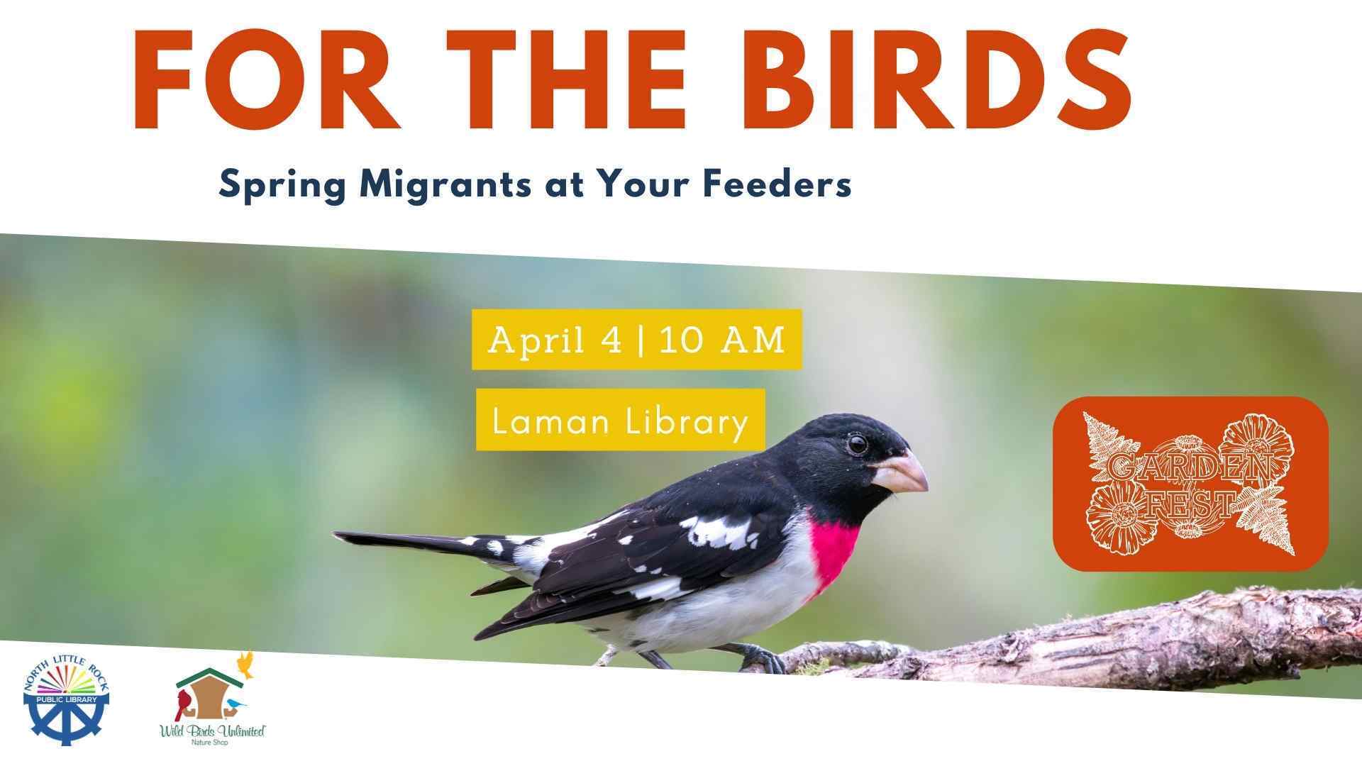 Welcome to Garden Fest 2026! Join us from 10am to 2pm on Saturday, April 4th for activities, lectures, and hands-on fun for all ages. In partnership with Wild Birds Unlimited, we’re discussing Spring migrants. You can expect to learn about Orioles, Grosbeaks, Buntings, and more. Whether you’re a seasoned bird enthusiast or a curious beginner, this program offers something for everyone. Birding kits will be available for checkout—come learn, observe, and connect with nature!