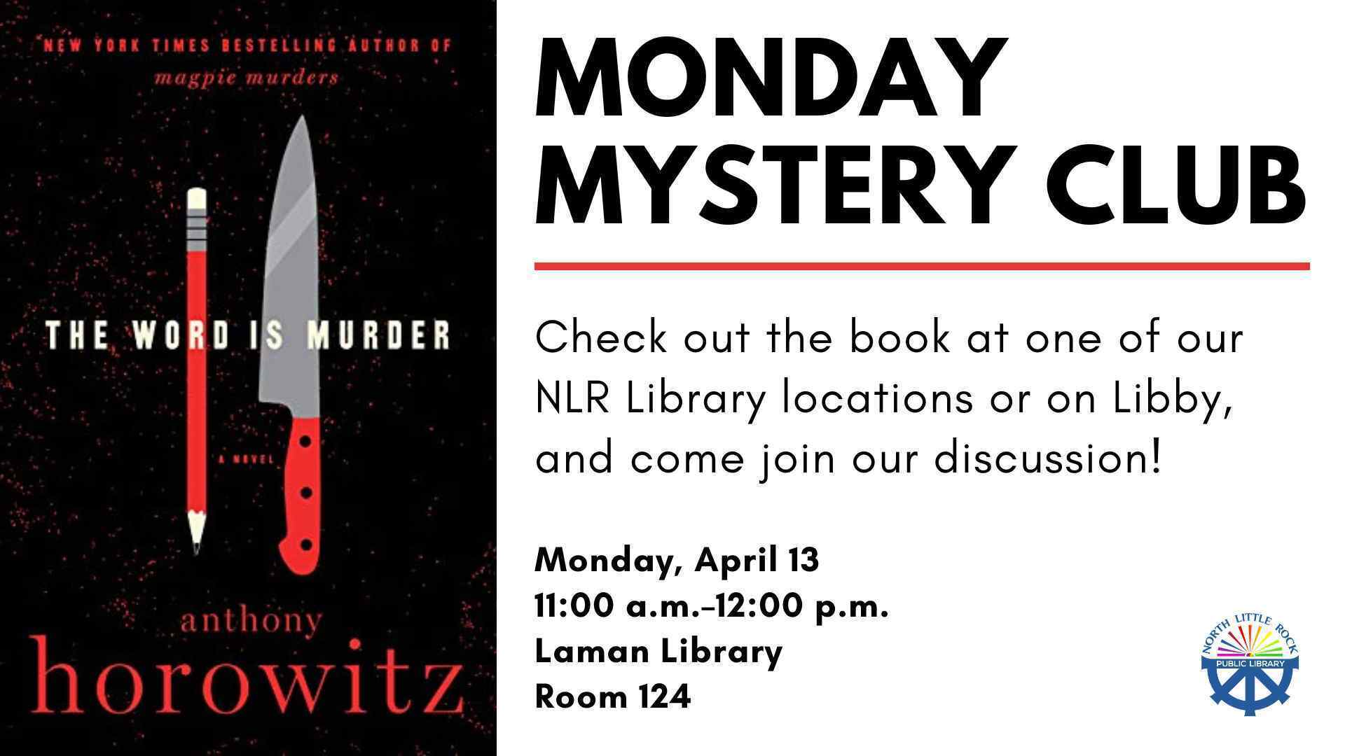 April's book selection is The Word Is Murder by Anthony Horowitz.