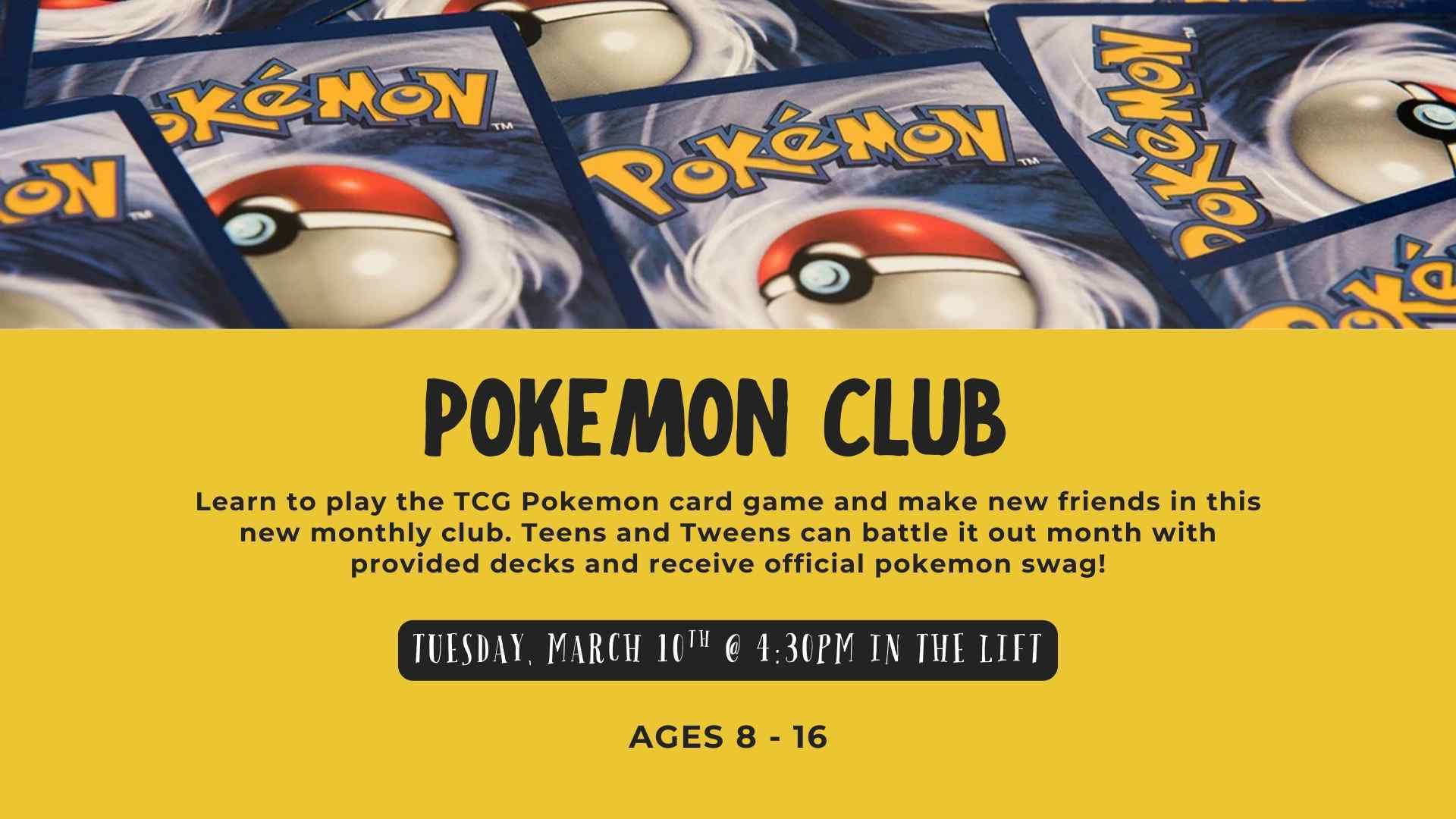 Learn to play the TCG Pokemon card game and make new friends in this new monthly club. Teens and Tweens can battle it out month with provided decks and receive official pokemon swag!