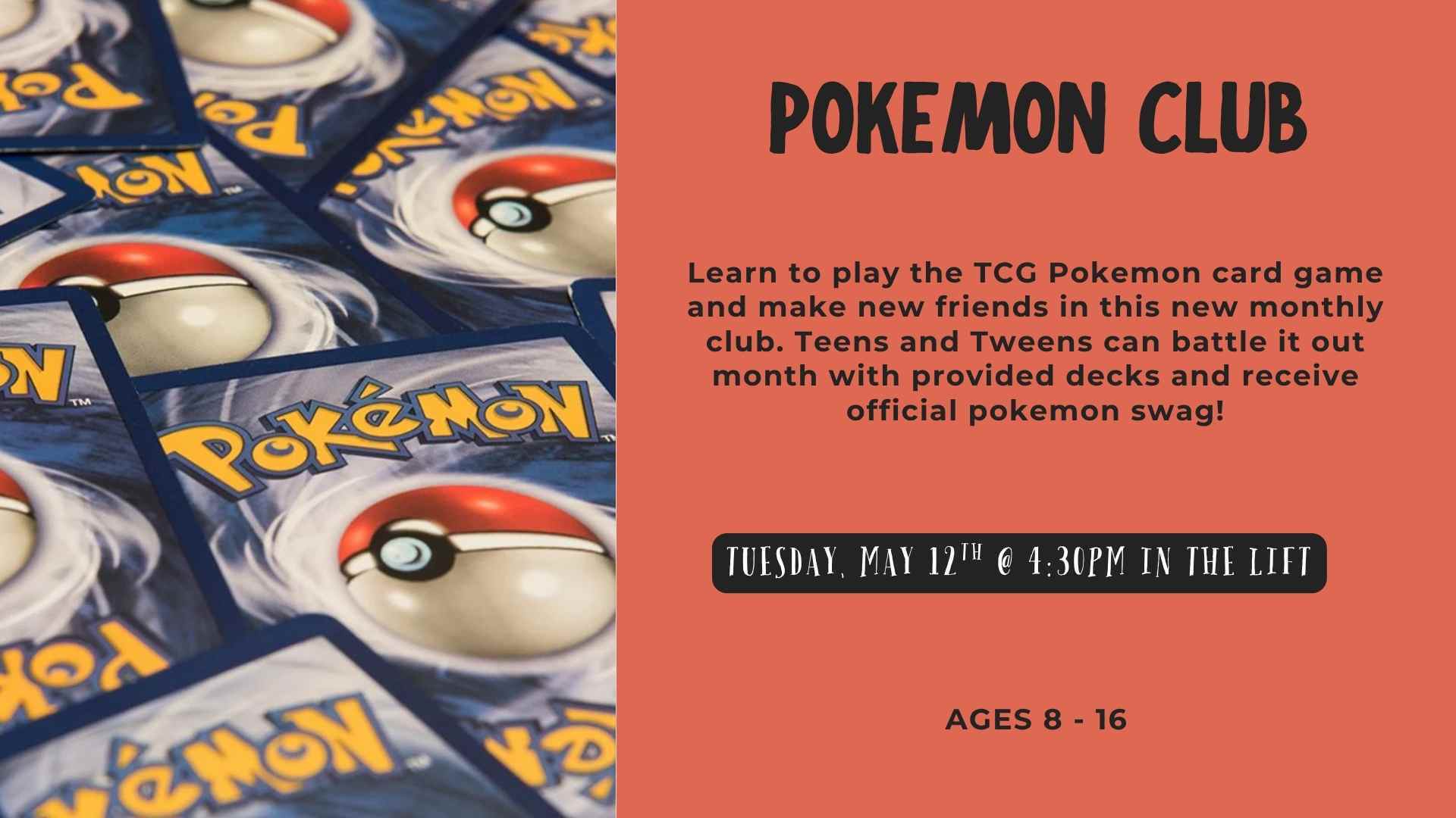 Learn to play the TCG Pokemon card game and make new friends in this new monthly club. Teens and Tweens can battle it out month with provided decks and receive official pokemon swag!