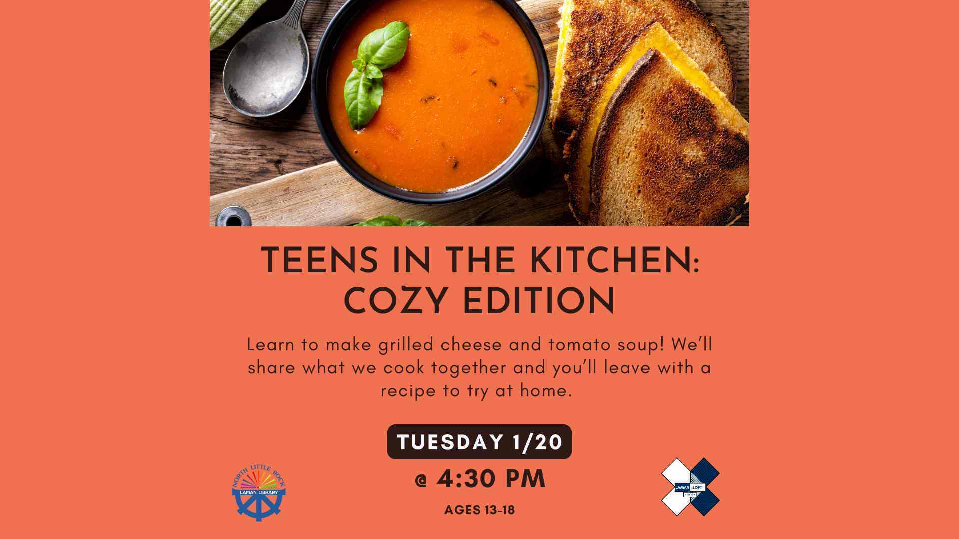 For this month's Teens in the Kitchen, you'll learn to cook tomato soup and grilled cheese sandwiches. We'll use best practices in the kitchen as we heat up the griddle and use an immersion blender. When we are finished, we will share our meal we've made together.
