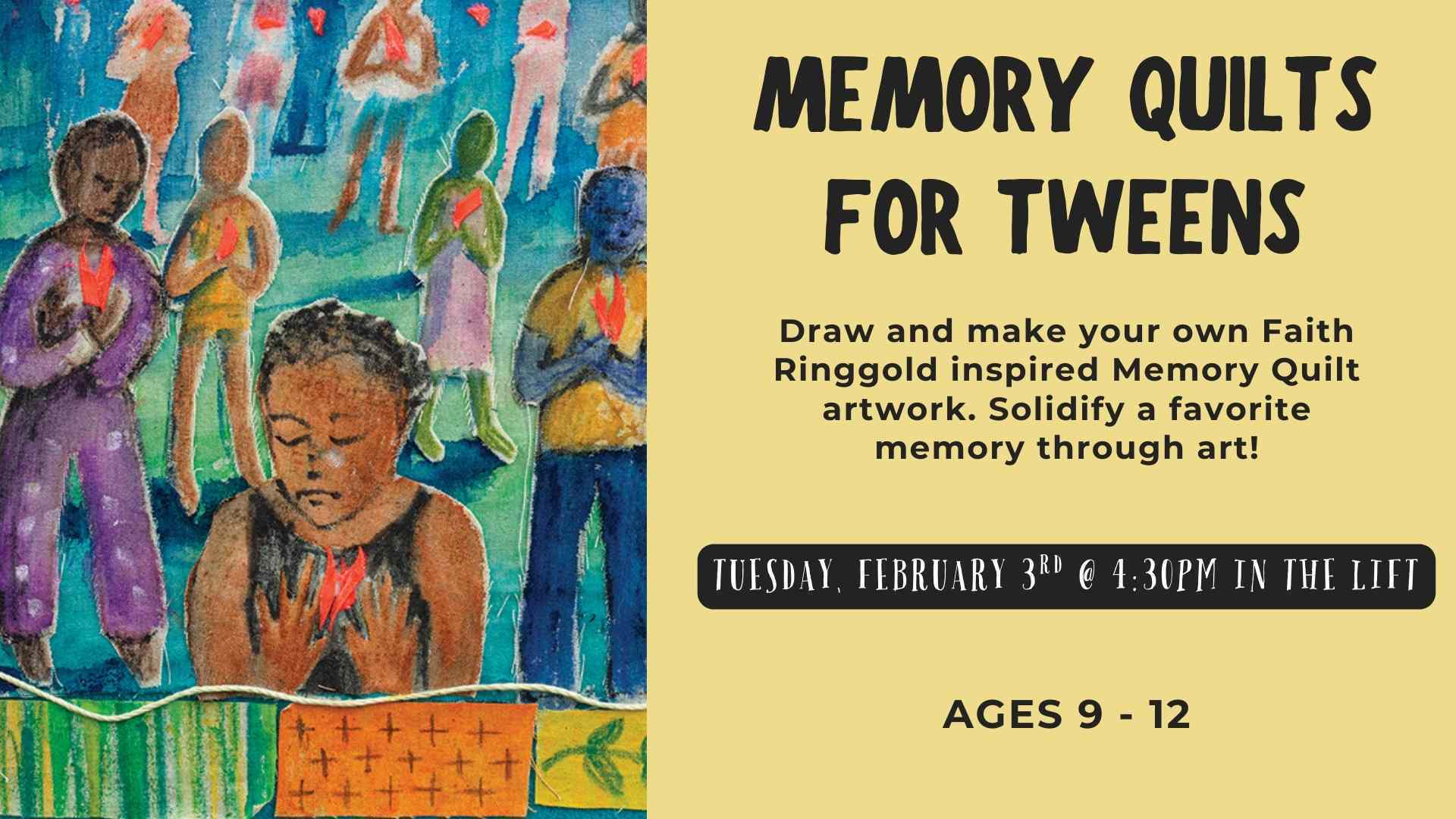 Draw and make your own Faith Ringgold inspired Memory Quilt artwork. Solidify a favorite memory through art!