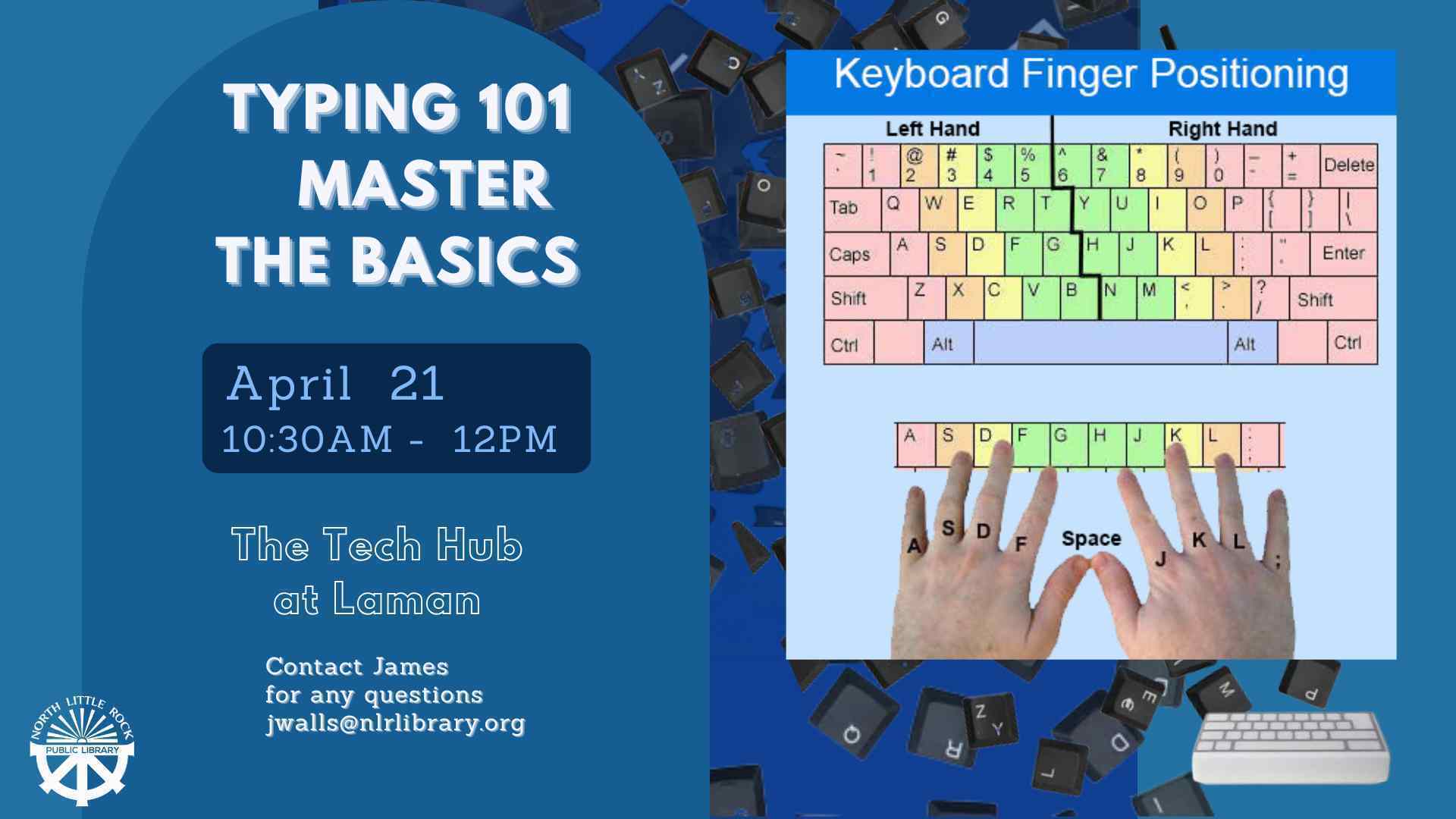 Ready to type faster, smarter, and with confidence? Join James in the Tech Hub for an interactive typing workshop that turns your keyboard into a tool of mastery! In this fun, hands-on session, you’ll learn techniques to boost your typing speed and accuracy while building the skill of typing with both hands eyes on the screen, not the keys. This program is designed for beginners to intermediate computer users who want to improve their typing comfort and efficiency. Whether you’re a student preparing for research projects, a professional aiming to type faster at work, or simply someone who wants to make computer use smoother and more enjoyable, this session is perfect for you. No special materials are needed--just bring your enthusiasm and be ready to practice on the Tech Hub computers provided by our library.