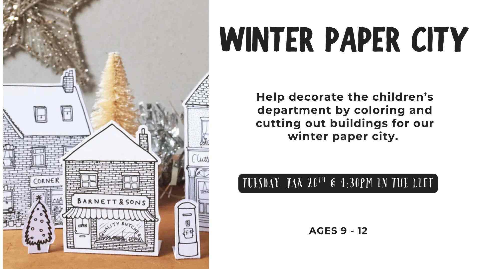 Help decorate the children’s department by coloring and cutting out buildings for our winter paper city.