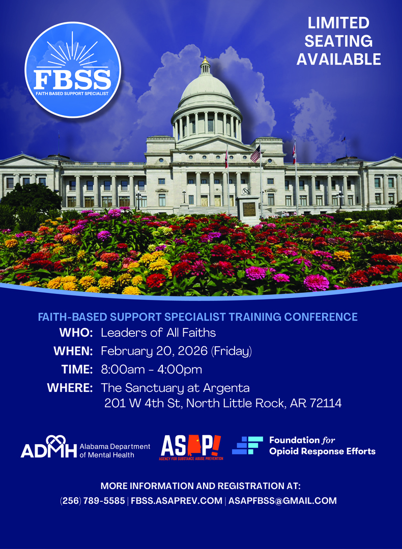 LITTLE ROCK, AR – February 20, 2026 — The Agency for Substance Abuse Prevention (ASAP) is proud to announce its upcoming Faith-Based Support Specialist (FBSS) Training Conference, set to take place at the Sanctuary at Argenta, 201 W 4th St, North Little Rock, AR 72114, from 8:00 a.m. to 4:00 p.m. This free, one-day event is designed to equip religious leaders of all faiths with the tools and certified resources necessary to address substance use within their communities. Breakfast and lunch will be provided.