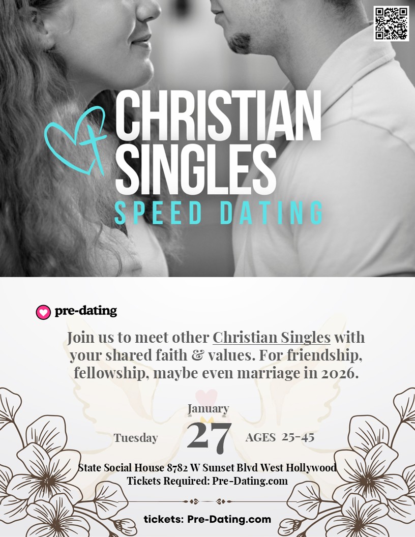 HomeEventsChristian Singles Speed Dating This Event has Passed Christian Singles Speed Dating Tuesday, January 27, 2026 7:30 PM - 9:30 PM 7:30 PM - 9:30 PM See all dates and Times State Social House Parking Deals Get a Ride LYFT UBER Add to Calendar 01/27/2026 07:30 PM 01/27/2026 09:30 PM America/Boise Christian Singles Speed Dating Details & Tickets: https://www.upcomingevents.com/los-angeles/events/state-social-house/christian-singles-speed-dating-588400?ref=uceaddevent State Social House, 8782 Sunset Blvd, West Hollywood, CA, 90069 Set Reminder Event Tag African American, For Pet Lovers, Good For Singles, Jewish, Special Event, Speed Dating Categories Nightlife, Religion & Spirituality, Singles View Event Website »