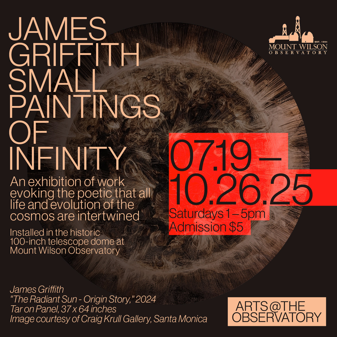 Mount Wilson Observatory presents a new installation in its “Arts@the Observatory” series featuring an exhibit by James Griffith: “Small Paintings of Infinity.” A free public opening reception with the artist will be held on Saturday, July 13, 2025, from 2:00–5:00pm. Curated by artist Stephen Nowlin, the exhibit will be presented inside the magnificent vaulted dome of MWO’s historic 100-inch telescope and will run every Saturday from July 19 through October 25, 1:00–5:00pm. Admission during the run is $5, with tickets available online or at the door. For more information on the exhibit, please visit https://www.mtwilson.edu/events/arts-griffith