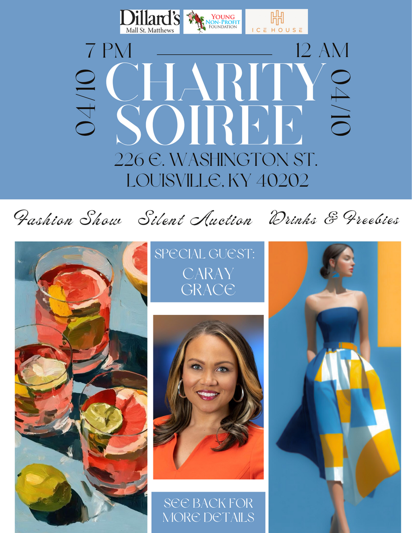 Join us for an elegant evening at the Charity Soirée on April 10th from 7:00 PM to 12:00 AM, hosted at 226 E. Washington St., Louisville, KY 40202.