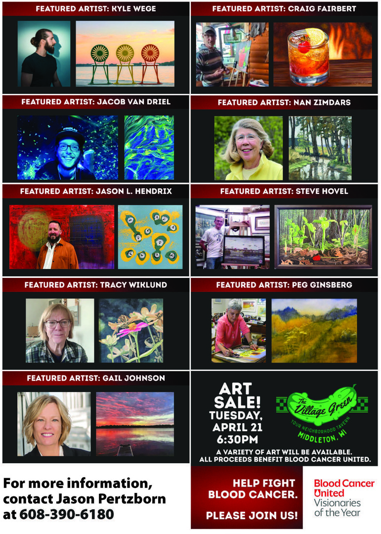 This unique event will showcase a diverse collection of artwork generously donated by talented artists from the greater Madison area. Featured artists include Kyle Wege, Peg Ginsberg, Jason Hendrix, Steve Hovel, Gail Johnson, Jacob Van Driel, Nan Zimdars and many more.