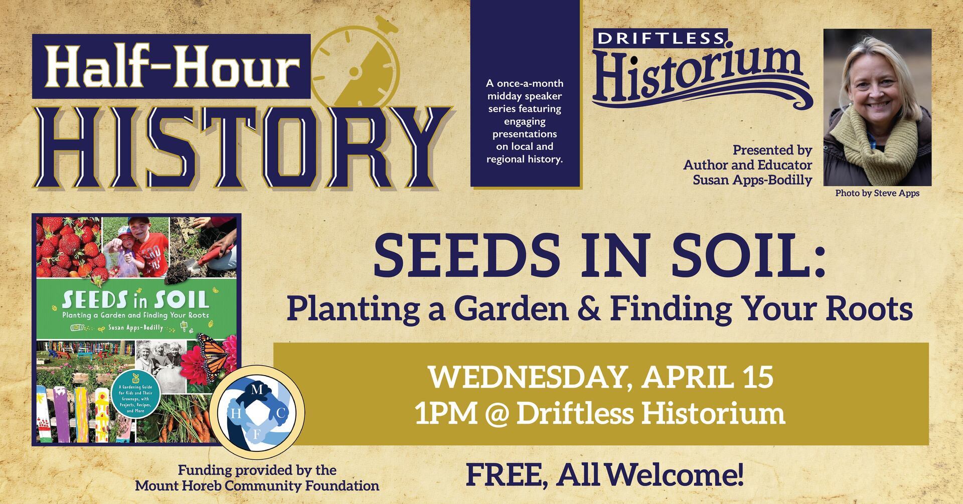 With spring just around the corner, April’s Half-Hour History spotlights gardening—with a dash of history, and a sprinkling of science! Join author and educator Susan Apps-Bodilly as she uses the stories of immigrants, First Nations, and her own family to explore how growers, new and experienced, can forge connections both under and above ground. Apps-Bodilly will present “Seeds in Soil: Planting a Garden and Finding Your Roots” on April 15, 2026, at 1:00 p.m. at Mount Horeb’s downtown Driftless Historium (100 S 2nd St).