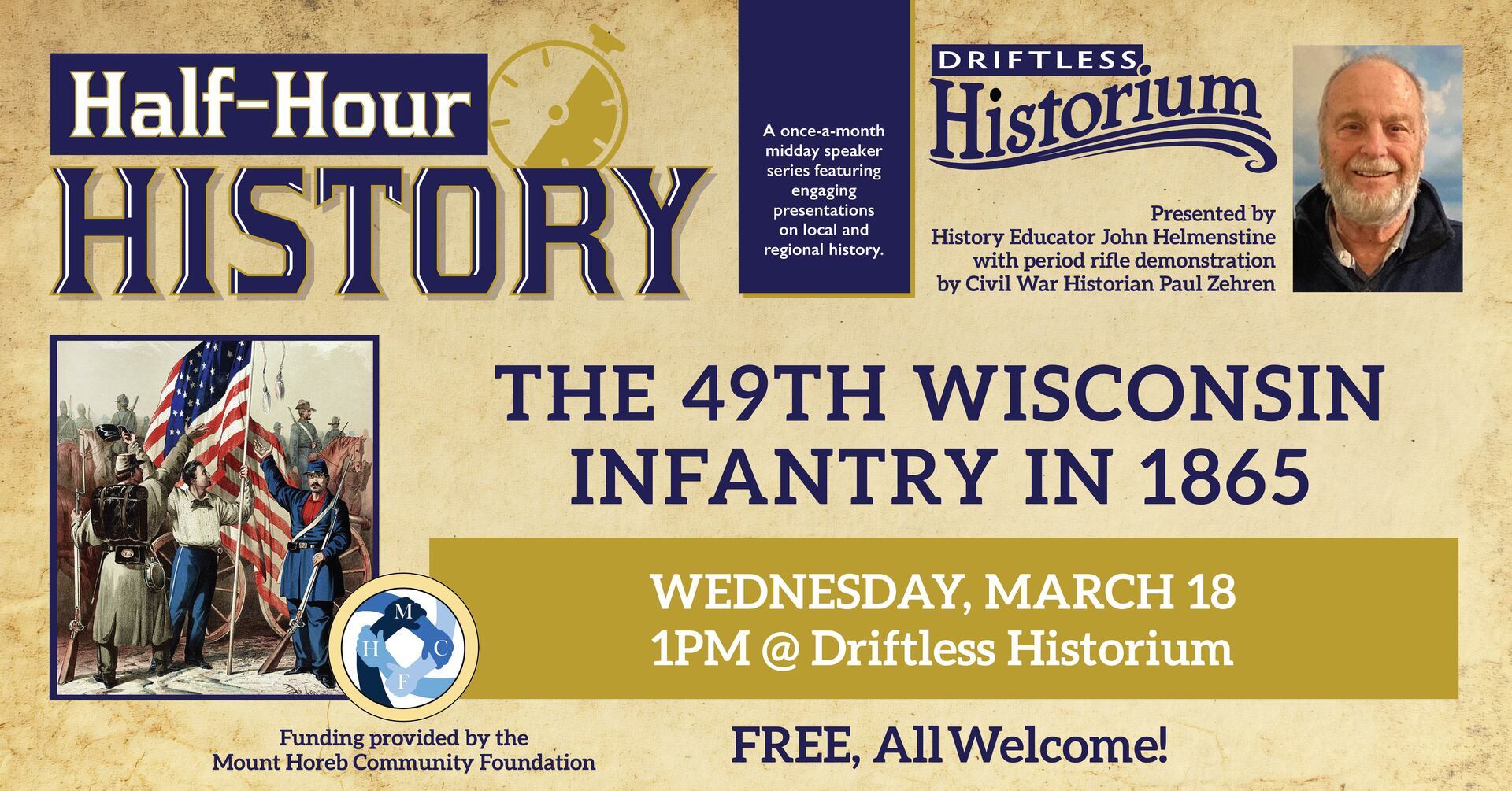 Join us on March 18 at 1:00 p.m. for the next installment of the Driftless Historium’s popular Half-Hour History series. Historian and Educator John Helmenstine will present “The 49th Wisconsin Infantry in 1865”—with a special period rifle demonstration by Civil War Historian Paul Zehren. Helmenstine will discuss the history of the Union Army’s all-volunteer 49th Wisconsin Infantry, from its formation at Madison’s Camp Randall to its service in Western Missouri at the end of the Civil War. Audience members will also hear about some of the 49th soldier’s experiences before and after the war.