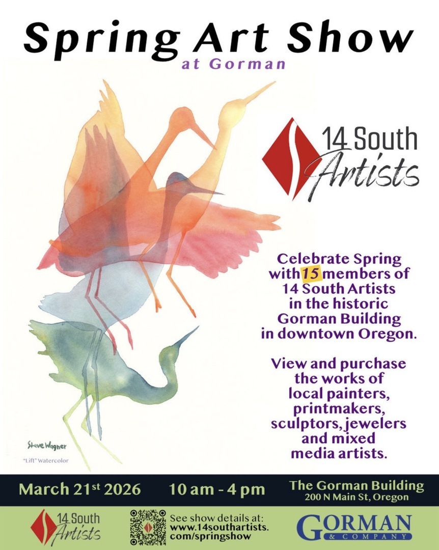 Visit with local artists and enjoy the creations by painters, printmakers, sculptors, jewelers, and mixed media artists. If you are looking for a local art association to join, membership Information will also be available and our artists are eager to share how their involvement in 14 South Artists has enriched their life. If you are new to the world of creating, or a life-long creator, or an avid collector of art, this event is has something to offer you.