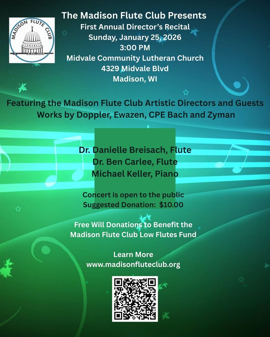 The concert is free and open to the public. At-will donations are gratefully accepted and will support the Madison Flute Club’s ongoing efforts to expand our collection of low flutes for the flute choir. The Madison Flute Club is a non-profit educational 501(c)(3) organization, and all donations—via cash, check, credit card, or Venmo—are 100% tax-deductible.