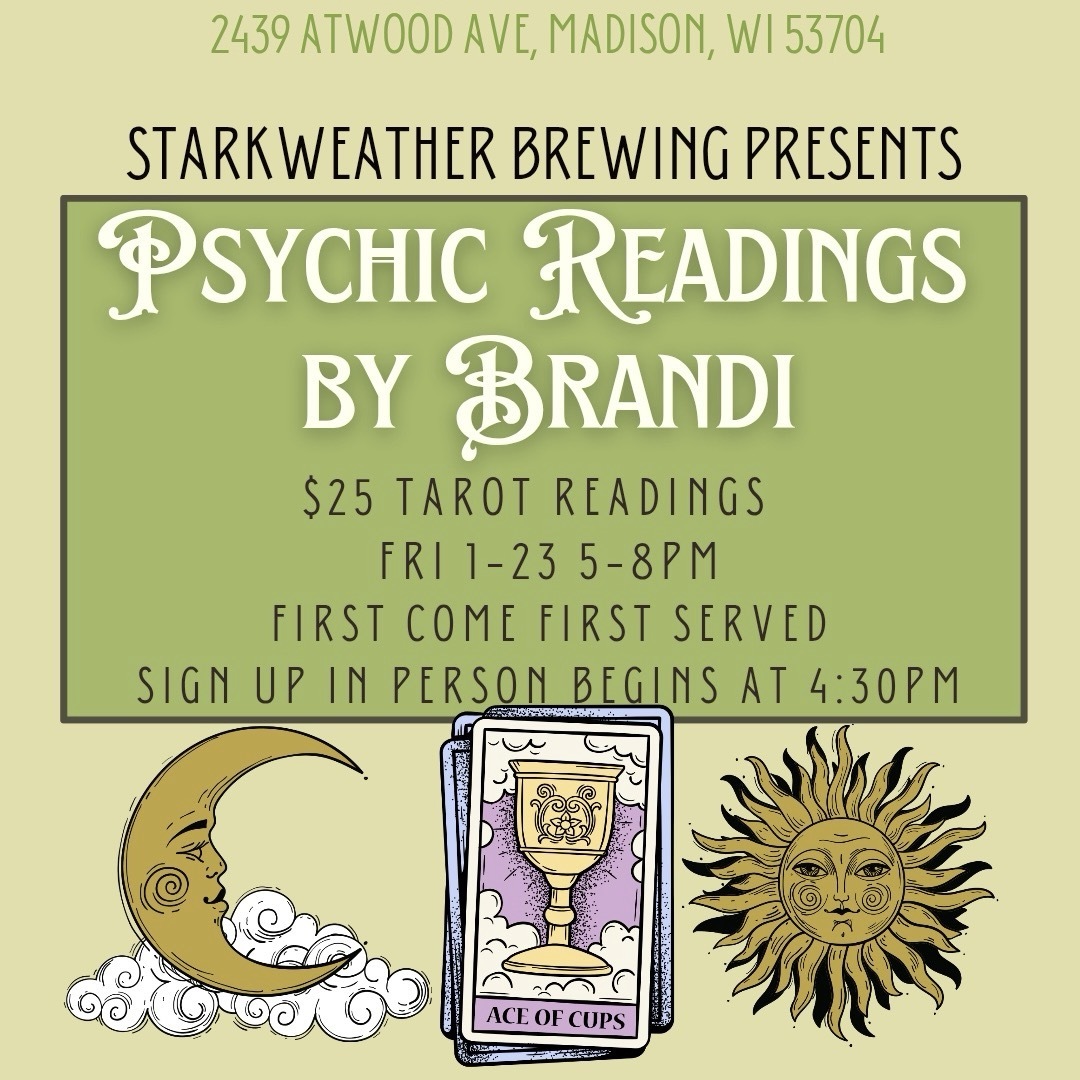 Join us for a night of insight and inspiration with Psychic Tarot Card Readings by Brandi. Only $25 for a 15-minute reading.