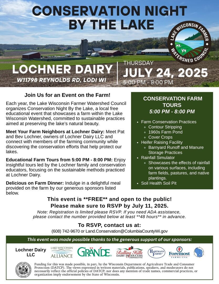 Join Us for an Event on the Farm! Each year, the Lake Wisconsin Farmer Watershed Council organizes Conservation Night By the Lake, a local free educational event that showcases a farm within the Lake Wisconsin Watershed, committed to sustainable practices aimed at preserving the lake’s natural beauty. Meet Your Farm Neighbors at Lochner Dairy: Meet Pat and Bev Lochner, owners of Lochner Dairy LLC and connect with members of the farming community while discovering the conservation efforts that help protect our lakes. Educational Farm Tours from 5:00 PM - 8:00 PM: Enjoy insightful tours led by the Lochner family and conservation educators, focusing on the sustainable methods practiced at Lochner Dairy. Delicious on Farm Dinner: Indulge in a delightful meal provided on the farm by our generous sponsors (Lochner Dairy LLC, Lake Wisconsin Alliance, Grande Cheese Company, Rolling Hills Dairy Producers Cooperative, Hartmann Farms LLC, Foremost Farms USA, Columbia County Land and Water Conservation Department, and DATCP.