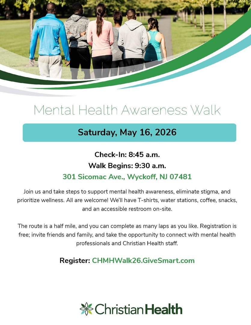 Christian Health will be hosting a Mental Health Awareness Walk at its Wyckoff campus (301 Sicomac Ave.) on Saturday, May 16, 2026, at 9:30 a.m. Check-in begins at 8:45 a.m.