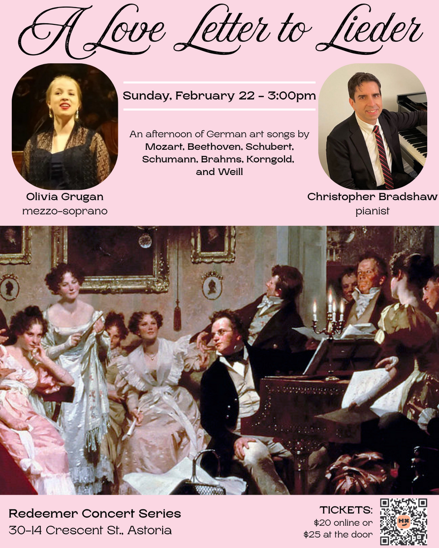 Mezzo-soprano Olivia Grugan, praised for her expressive depth and radiant tone, joins pianist Christopher Bradshaw, a sensitive and dynamic collaborator, in a richly varied selection of songs by Mozart, Beethoven, Schubert, Schumann, Brahms, Korngold, and Weill. Together, they illuminate the emotional power of Lieder—from Romantic intimacy to cabaret-tinged modernism—revealing how composers used the human voice and piano to write deeply personal letters to the heart.