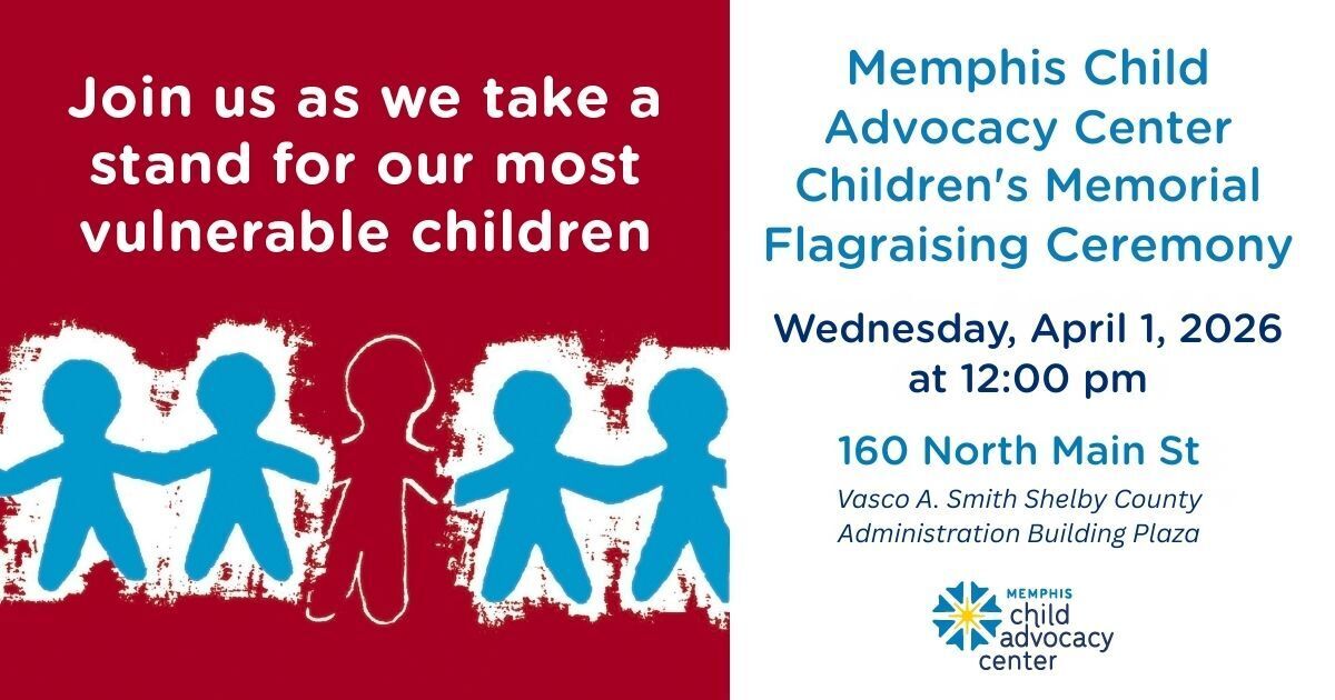 The Memphis Child Advocacy Center will raise the Children’s Memorial Flag for children who have died due to abuse or neglect in the past 12 months. Rabbi Micah D. Greenstein, Mayor Paul Young, Juvenile Court Judge Tarik B. Sugarmon, and other community leaders will speak. A dove will be released for each child. The Shelby County Sheriff’s Office Pipes & Drums and the MPD Peacemakers will perform. April is National Child Abuse Prevention Month. In case of rain, event will be in the Shelby County Administration Building lobby. #CACRemembers